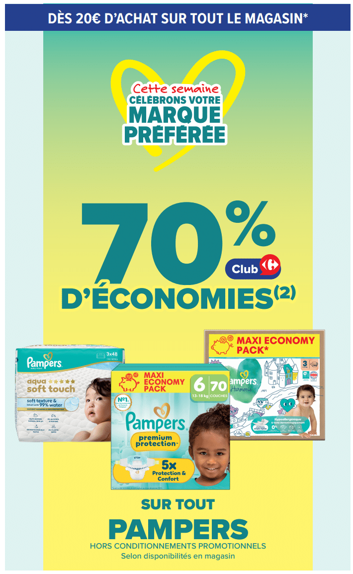 Faut-il acheter uniquement des couches Pampers pour activer le -70% ? Non, il suffit de faire 20€ d’achats sur tout le magasin. Vous faites vos courses normalement et vous ajoutez vos Pampers, la remise s’applique automatiquement.
