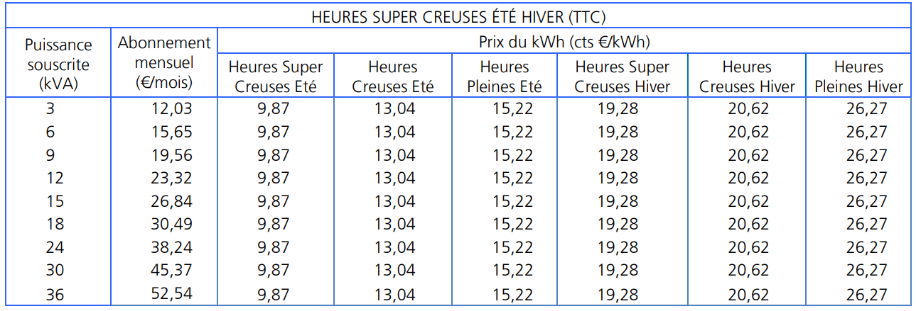- Super heures creuses : 19,28 cts