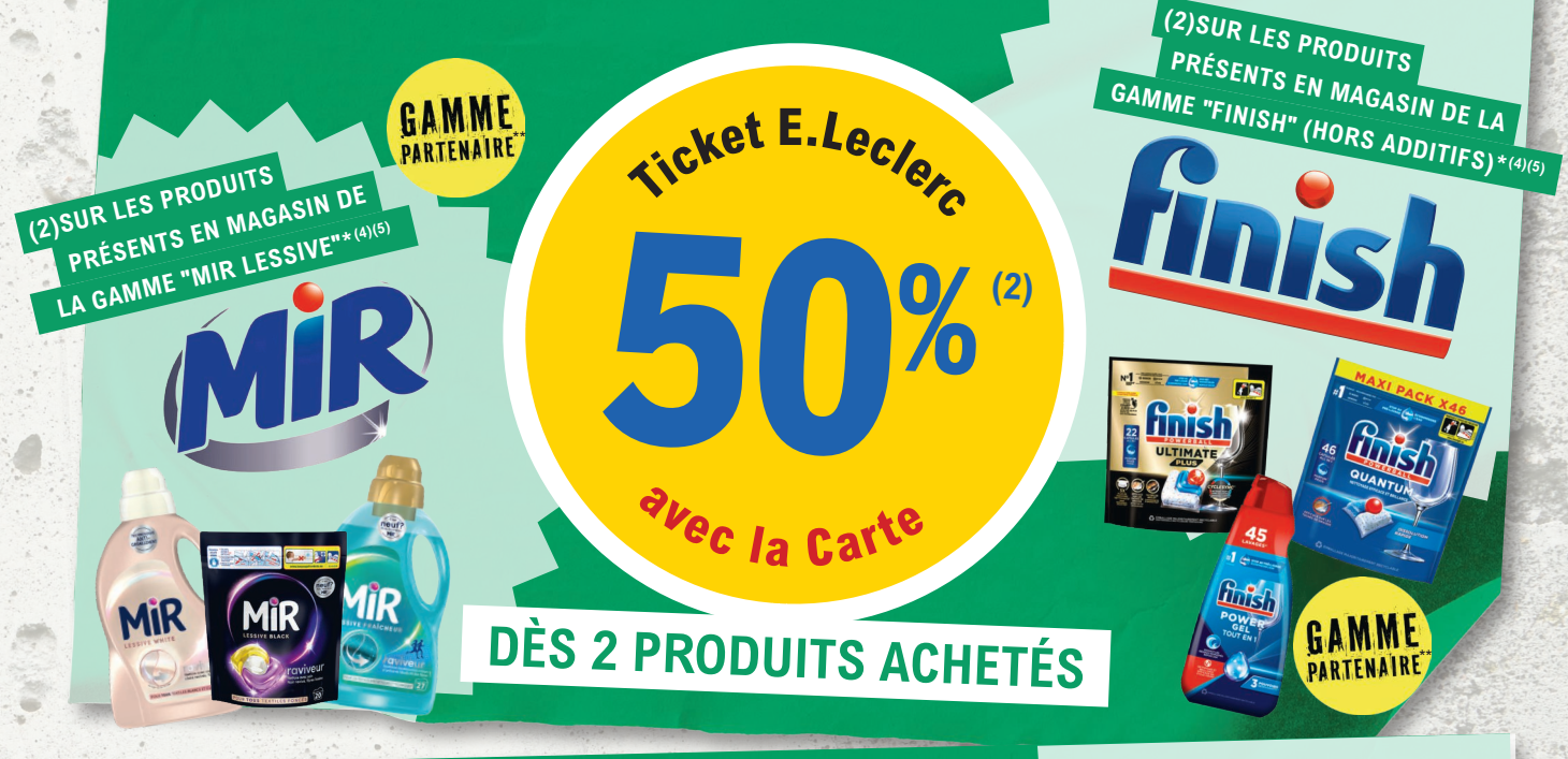 - Finish : -50% en carte 🍽 → les pastilles lave-vaisselle qui font tout le boulot pendant que toi t’es en mode sieste radinesque.