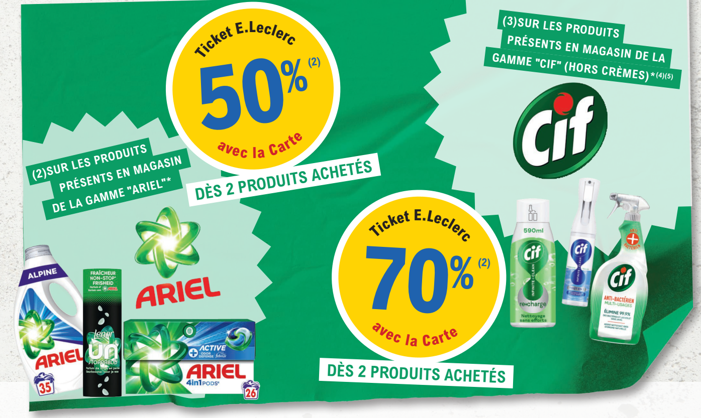 - Ariel : -50% en carte 👕 → la lessive qui d’habitude coûte un bras de T-Rex. Là, c’est moitié prix en carte : tu fais ton stock, et ton linge sentira le paradis sans que ton compte sente la cata.