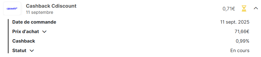 - Il reste 6,99€ à payer en carte bancaire → et bim, encore 0,71€ de cashback “normal”.