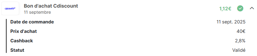 - Sur ce bon, Widilo me rend 1,12€ en cashback.